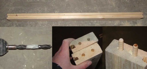 Отверстия под шканты сверлим в торцах планок с пазами. Точно определитесь с их расстоянием от края — они должны быть строго на одном уровне на всех планках.