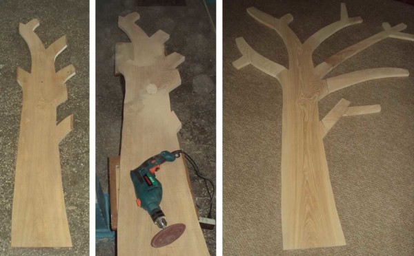 Берем электро-лобзик и по нанесенным контурам вырезаем заготовки. Далее черед очень пыльной работы — шлифуем древесину, одновременно подгоняя по толщине места стыковки с «ветками». Использовали дрель с резиновой насадкой и наждачкой. Сначала крупное зерно, потом среднее и мелкое.