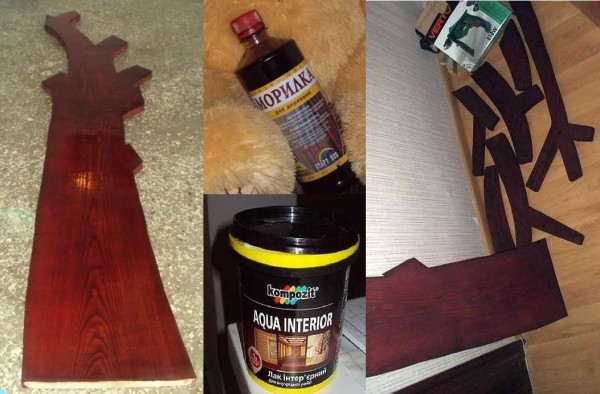 После того как результат удовлетворил — стало гладкое и хорошо проступал рисунок древесины — настал черед морилки. Это цвет «махагон», нанесенный в четыре слоя. После высыхания покрыли все лаком на водной основе. Нанесли три слоя с перерывами в три часа.