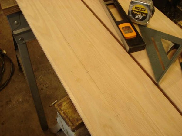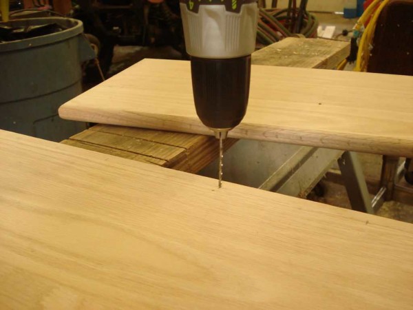 Две доски надо соединить под прямым углом. Шаг установки саморезов — 10-15 см. Размечаем места на боковине, переносим их на торец. Точность требуется высокая. Прикладываем одну к другой и тонко отточенным карандашом переносим отметки. По разметке делаем отверстия.