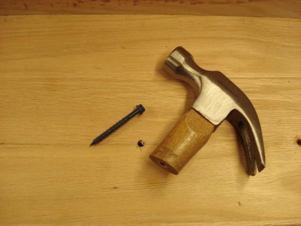 Далее отмечаем карандашом места под саморезы. Снимаем крючки, сверлим отверстия. Сверло — на 1-2 мм меньшего диаметра, чем диаметр самореза. Отверстие надо чтобы работа шла легче, а еще чтобы не растрескалась поверхность при закручивании. Сажаем крючки на место.