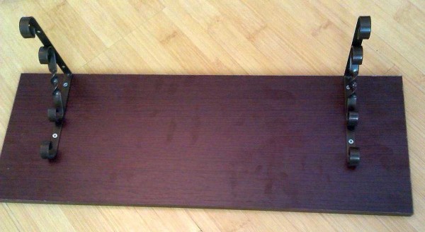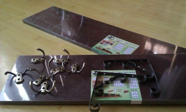 Задача — сделать на стену дешевую вешалку для одежды (для съемной квартиры). В строительном магазине куплены две доски из ламинированного ДСП под названием «мебельный щит». Две, потому что цена оказалась невысокой, а в отделе фурнитуры, где искали крючки, нашлись неплохие кронштейны за совсем небольшие деньги. Их и используем для второй доски — сделаем полочку для мелочей.
