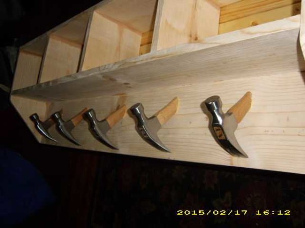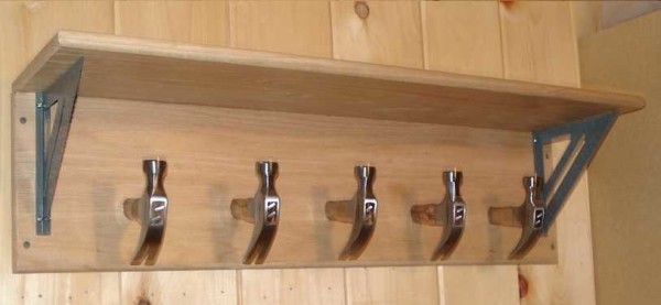 Идею можно взять за основу, использовать любые другие «крючки» и упоры. Эта настенная вешалка своими руками сделана из двух струганных досок толщиной 25 мм, двух столярных угольников и пяти молотков.
