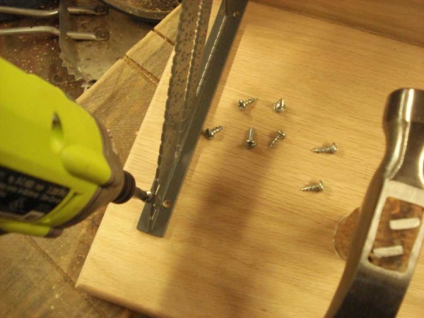 Устанавливаем упоры-угольники. Так как использованы угольники столярные, в них никаких отверстий не было. Их просверлили — по два сверху и снизу на каждой планке. На одном упоре получается 8 шурупов. Их берем мелкие — на более 20 мм, чтобы не прокололи древесину. Потому требуется их большое количество.