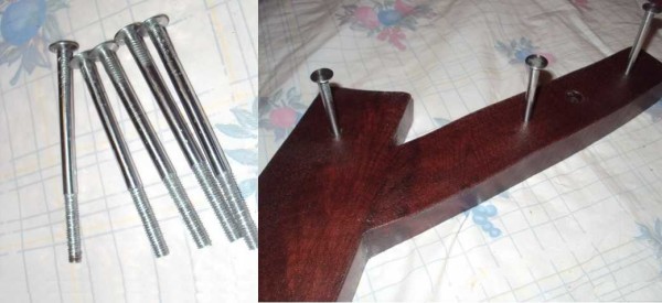 В качестве крючков использованы гвозди 200 мм. Их обрезали по нужной длине (разные — длиннее для верхней части вешалки, покороче закрепим внизу). Шляпки и стержень отшлифовали для гладкости, на нижней части нарезали резьбу в толщину доски (25 мм). В «ветках» предварительно сделали отверстия, в них вкрутили «крючки».