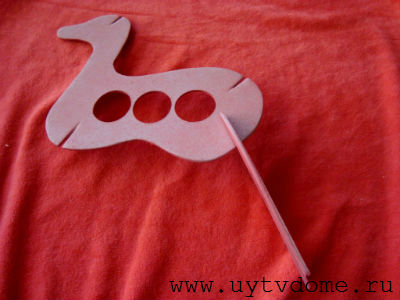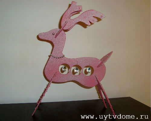 5. Как сделать оленя своими руками – сборка деталей. Вставляем в прорези туловища оленя сначала задние части ног, затем передние, после устанавливаем хвостик, собираем конструкцию из ушек и рожек, которые продеваем в прорезь на голове.