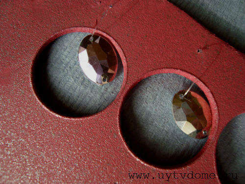 Ну а сейчас будем закреплять акриловые стразы (пришивные с отверстиями), кстати вместо страз Вы можете использовать любые легковесные элементы – снежинки из бумаги, желуди, бусины, мелкие елочные шарики, отрезки цепочки,  шарики из фольги, ватные шарики, миниатюрные бантики и т.д. Выше круглых отверстий в туловище оленя создаем проколы иглой, в которые продеваем небольшие отрезки лески, на которые подвешиваем акриловые стразы, чтобы не завязывать узелки, просто склеиваем концы лески вместе.