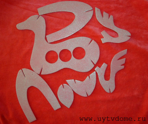 1. Перерисовываем шаблон (на фото ниже), вырезаем. Должны получиться следующие детали: туловище 1 шт., ноги 2 шт., хвост 1 шт., ушки  1 шт., рога 2 шт.