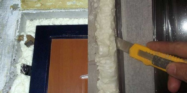 Время, необходимое на затвердение пены, зависит от температуры и влажности воздуха, но в среднем составляет 8-12 часов (для некоторых видов могут потребоваться сутки). Излишки затвердевшей пены срезают ножом, штукатурку, которая плохо держится, удаляют, сметают пыль и грязь. Можно начинать работы по отделке дверных проемов.