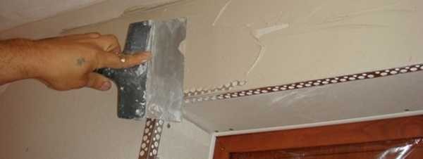 Перфорированные уголки выставляют по уровню и в одной плоскости с основной стеной. Образовавшиеся пустоты заполняют разведенной до пастообразного состояния шпаклевкой. Для первичного выравнивания используют стартовую шпаклевку. После того, как она высохнет, все неровности сглаживают специальной сеткой. Ее применяют вместо наждачной бумаги, которая шпаклевкой забивается моментально. Сетка для зашкуривания шпаклевки продается в тех же магазинах, где продают гипсокартон. На выровненную поверхность затем  и наносят слой финишной, выравнивающей шпаклевки. Ее после высыхания тоже нужно довести до идеально ровного состояния. Делают это все той же сеткой, только более тонкой.