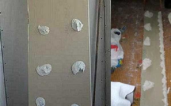 • На листы наносят лепешки из разведенного до состояния пасты состава для работ с гипсокартоном (лучше — финишный, он более «липкий»). Они должны располагаться по периметру и кое-где в середине.
