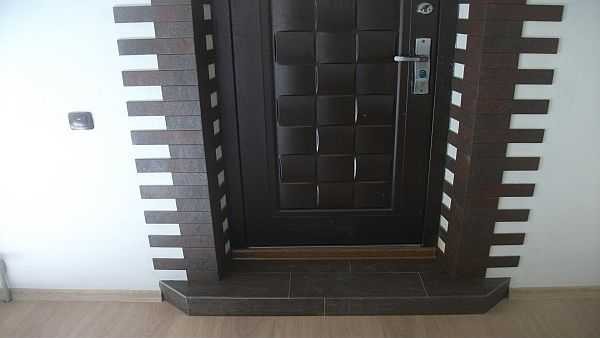 Если говорить об отделке входной двери снаружи, то тут вариант по сути один — только заделка откосов из штукатуркой. Другое дело, что на нее можно закрепить керамическую плитку, отделочный камень, другие подобные материалы. Последовательность действий в этом случае следующая: