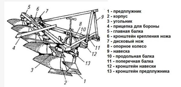 • корпус — состоит из стойки к которой прикреплены лемех с отвалом и полевая доска;