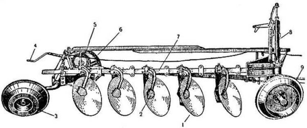 По количеству корпусов плуги бывают однокорпусные, двухкорпусные и многокорпусные. Корпус состоит из нескольких частей: