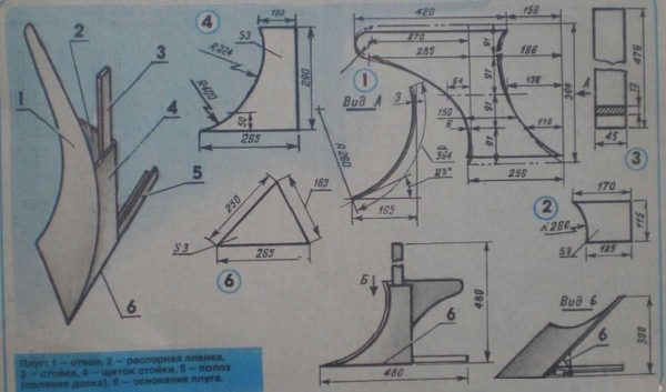Собираясь сделать плуг своими руками, необходимо иметь какой-то образец для подражания. Если есть старый плуг, можно сделать новые по его подобию. А если такого нет, пригодятся чертежи. Только учтите параметры своей техники, на которую будете его навешивать.
