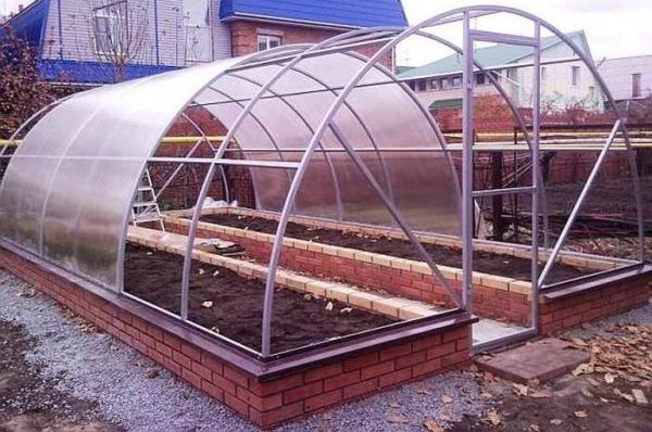 Далее можно крепить обвязку, а можно надстроить пару рядов кирпича и только после этого устанавливать каркас. После этого можно сказать, что теплица из поликарбоната своими руками почти готова. Осталось закрепить поликарбонат.