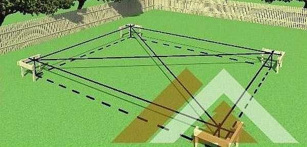 • В углах бурят лунки диаметром 30-40 см и глубиной ниже глубин промерзания грунта (используют бур). Затем такие же лунки бурят по периметру. Расстояние между ними должно быть где-то 2-2,5 метра.