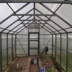 Решает эту проблему другая конструкция — с составным каркасом, сваренным из нескольких кусков. Из грунта/от основания выходят прямые стойки, которые поднимаются на высоту не менее полутора метров. К ним приваривается дуга. При таком устройстве крыша получается округлой, стенки — прямыми. Даже вдоль стен работать можно без проблем, выпрямившись во весь рост.