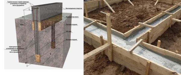 Есть варианты фундамента этого типа. Можно в подготовленную траншею установить фундаментные бетонные блоки малых размеров, пространство между ними заполнить раствором. Устанавливать их надо так, чтобы их край был ниже уровня земли. Поверх заливается слой бетона, выравнивается. Закладные закрепляются в швах.