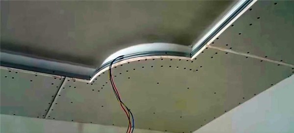 Далее к профилю крепится полоса гипсокартона шириной в 5 см. Из особенностей — крепление посередине, а не сверху и снизу: слишком маленькая высота. Изгибы делаются тоже знакомо. Надрезаем полосу каждые 4-5  см, ломаем гипс и крепим.