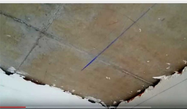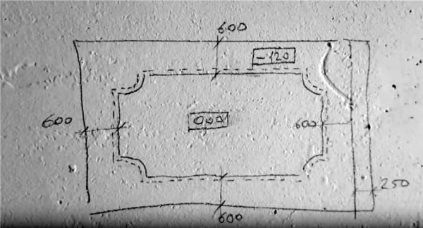 Сначала делают разметку на потолке. Все заданные размеры откладывают, при помощи малярного шнура прорисовывают линии. Обратите внимание, что линия на потолке прокладывается на расстоянии 54 см, а не 60 см, как на первой схеме. Она получается с учетом того, что ступенька выдвинута вперед на 6 см.