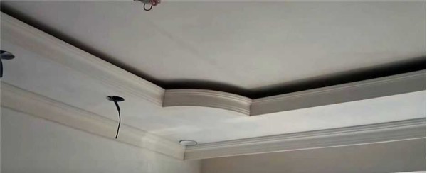 В данном варианте, чтобы облегчить работу и придать потолку законченный вид к бортику приклеены галтели (потолочный плинтус). Похожие приклеены и на стыке короба и стены.