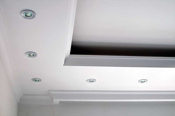 Подсветка гипсокартонного потолка бывает скрытой и открытой. Открытая — точечные светильники, которые полностью или частично видны. Скрытая потому так и называется, что видно только ее излучение. Потому при монтаже потолка из гипсокартона со скрытой подсветкой короба нижнего уровня делают с полочкой, на которой и размещаются осветительные приборы.