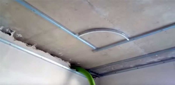 Затем берем  кусок несущего профиля длинной 9,8 см, только подрезаем его и сверху и снизу. Примерно в середине дуги заводим один край за профиль, крепим саморезом.