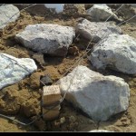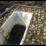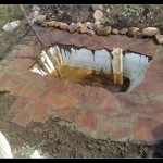 Начиналось все также: котлован, установка ванны, трамбовка вокруг земли. Только захотелось сделать мощеную площадку вокруг пруда, а грунт глиняный: на него ничего не уложишь. Потому была придумана такая хитрость: разложили крупную фракцию щебня, резиновой киянкой их загнали вглубь