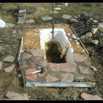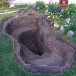 - Необходимо выкопать котлован по форме чаши. Если форма очень нестандартная, можно перевернуть ее в месте установки вверх дном, очертить чем-нибудь контур (хоть обкопать лопатой). Чашу относят в сторону, копают котлован. Он должен по размерам быть чуть больше — чуть шире, но не глубже. Края или должны находится на одном уровне с грунтом, или чуть выступать. Если получится приподнять немного края будет даже лучше: во время дождя не будет затекать грязная вода.