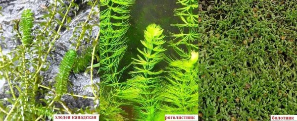 Чтобы в воде было достаточно кислорода, можно посадить элодею канадскую, роголистник и болотник. Они на фото ниже. Высаживаются в воду — это водные растения.