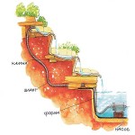 Второй вариант самодельного пруда на первых этапах строится практически также, как и первый. Только после того, как глубина котлована достигла проектной, борта приподняли, выложив по краю кирпичом и забетонировав. Получился водоем с приподнятыми бортами. Еще сделана система циркуляции воды. Она представлена на рисунке ниже.