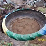 Мини-прудик можно сделать из старой автомобильной шины, вернее из покрышки. Чем она больше, тем больше и водоем. Самое сложное в этом деле — отрезать одну боковую часть. Если в результате края получились острые, их нужно обработать наждачной бумагой. Вторая по сложности задача — выкопать яму подходящего размера. На этом трудности закончились. Остальное — совсем легко.