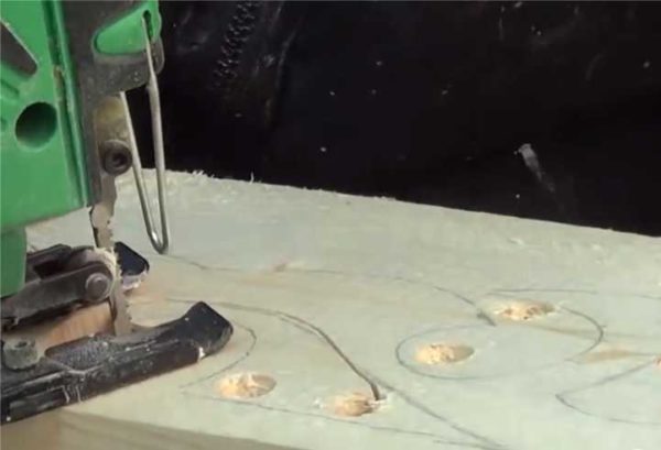 - Для этого сверлим отверстия большого диаметра в тех местах, где древесину надо будет убрать. Диаметр отверстия должен быть чуть больше чем ширина пилки лобзика обычно 12-14 мм). Сверло должно идти вертикально вниз, следите чтобы отверстие не вышло за линию (но небольшие погрешности нестрашны).