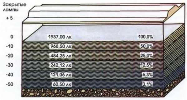 Каждые 10 см глубины «съедают» 50% от уровня освещенности