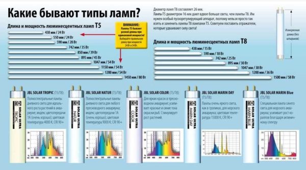 В аквариумистике обычно используют два типа люминесцентных ламп — Т5 и Т8. Чаще используют Т8. У них оптимальное соотношение цены и качества. Лампы Т5 при меньшем диаметре (16 мм против 26 мм) света дают в два раза больше, но и стоят в два раза дороже Т8. А так как менять их все равно в один срок, то и используют чаще «восьмерки».