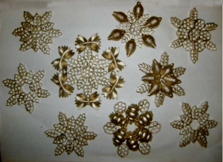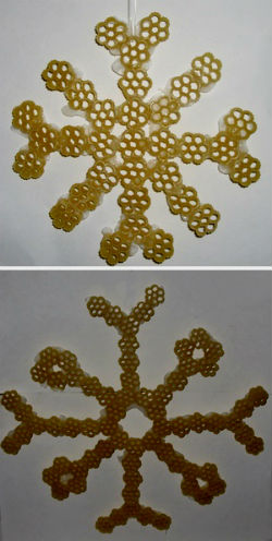 Приступим… Высыпаем подобранные макаронные изделия на разные тарелочки, покрываем стол газетой или бумагой, придумываем форму будущей снежинки из макарон (выше и ниже представлены фото всевозможных форм макаронных снежинок, можно взять их за основу). Итак, придумав форму снежинки, выкладываем макароны в нужном порядке на поверхности стола, после чего все детали склеиваем прозрачным клеем друг с другом (причем клеить лучше начинать с внутреннего круга изделия, в противном случае снежинка получится очень хрупкой). После склеивания всех деталей, готовые снежинки из макарон следует оставить примерно на сутки до полного высыхания.