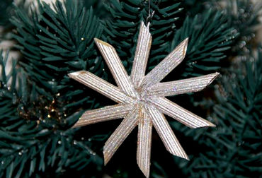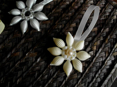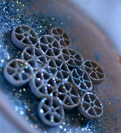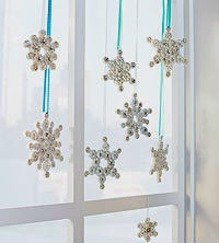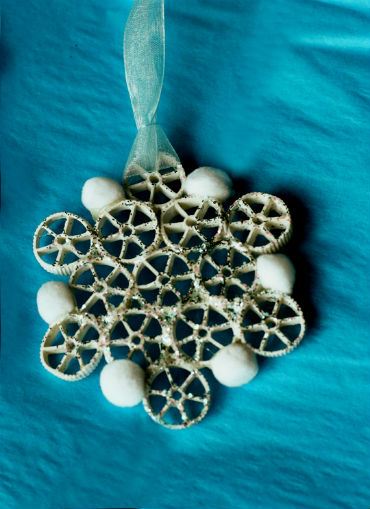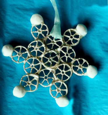• Итак, определившись со способом окраски и покрасив изделие, ждем, когда снежинки просохнут, и приступаем к следующему декоративному этапу — украшению… Снежинки из макаронных изделий покрываем слоем клея ПВА, и сразу же посыпаем блестками, искусственным снегом, сахаром, солью или манной крупой (чем-то одним из перечисленного или удачно скомбинировав несколько видов озвученных присыпок). В завершении, изделие можно декорировать лентой, бантиком, стразами или бусинами, и конечно же не забыть продеть леску или веревочку.