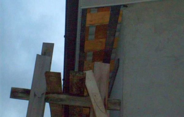 Устанавливаются такие треугольники примерно через каждый метр. Если фасад позволяет, их прибивают, если нет — обходятся только силой тяжести. Основная нагрузка в данной конструкции приходится на упорную доску — ту, которая ставится под углом и одним концом упирается в землю, другим — в вершину треугольника. Эти упоры делают из бруса, доски толщиной не менее 50 мм, трубы солидного диаметра (не менее 76 мм) или сечения (для профилированной трубы не менее 50*40 мм). При установке упора, его ставят точно в угол, забивают в землю, дополнительно фиксируют, вбивая клинья.
