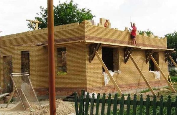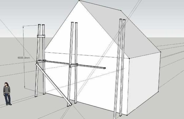 На рисунке слева подмости-конверт или армянские строительные леса. Конструкция проста и надежна, хоть и не кажется таковой. Но она проверена уже на многих тысячах строящихся домов. Привлекательна тем, что требует минимум строительных материалов, собрать/разобрать/передвинуть их можно за считанные минуты. Основное — изготовить треугольники, а установка на заданную высоту времени отнимает немного: поднять треугольник, подпереть наклонной балкой, которую в земле зафиксировать.