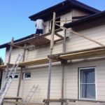 Такой вариант строительных лесов хорош, например, при обшивке дома сайдингом. Обшивка идет снизу-вверх, высоту приходится все время менять, прислонится или зафиксироваться к стене нет никакой возможности. Поэтому данный вариант для такого случая — самый лучший.