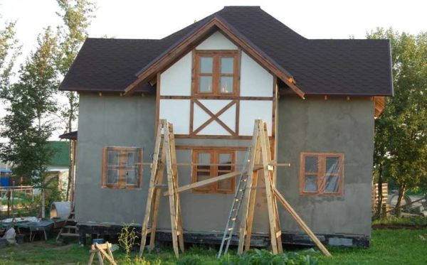 Для работ на фронтонах или при наружной отделке невысокого одноэтажного дома используют строительные козлы, на перекладины которых укладывают настил.