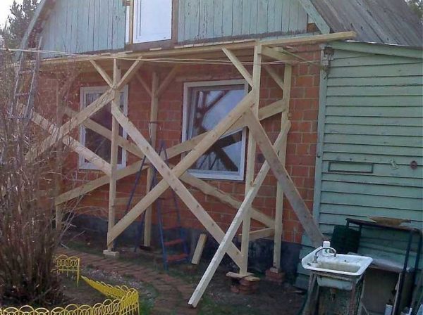 Можно собрать небольшие строительные леса из старых, но крепких досок. Иногда для раскосов и упоров используют жерди или трубы — что есть в хозяйстве