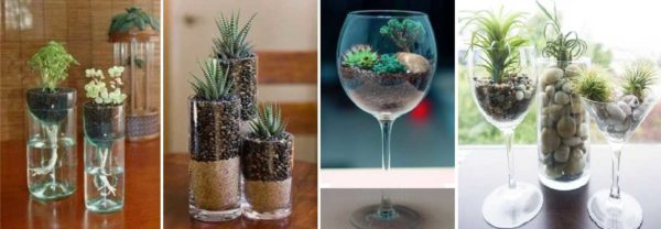 При создании композиций состав растений желательно подбирать не только по внешнему виду. Проще ухаживать за мини-садом в вазе, если растения с одинаковыми условиями произрастания. В этом случае их можно высаживать в грунт. Но, если вы используете растения «некарликового» размера, в горшке его проще вынуть. Горшочки маскируют песком или декоративными камнями.