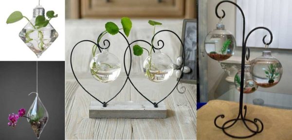- Емкость для флорариумов должна способствовать сохранению влаги. Шары или другие емкости с отверстиями сбоку отлично для этого приспособлены. Чуть хуже если отверстие сверху, но оно меньшего диаметра. Ровные по всей ширине сосуды подходят для кактусов и суккулентов. Им повышенная влажность ни к чему. Но если хотите, можно посадить и тропическое растение. Но в этом случае понадобится крышка.