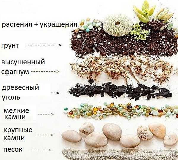 После того как определились с составом растений, можно задумываться о том, в какую почву их высаживать. Сам состав почвы выбирается под требования растений. Можно только обговорить состав под кактусы и суккуленты: две части дерново-глинистой земли, по одной части перегноя и речного песка, можно добавить еще кирпичной крошки. Перед тем как сделать флорариум, поговорим о последовательности слоев. Вам надо будет запастись материалами в достаточном количестве.