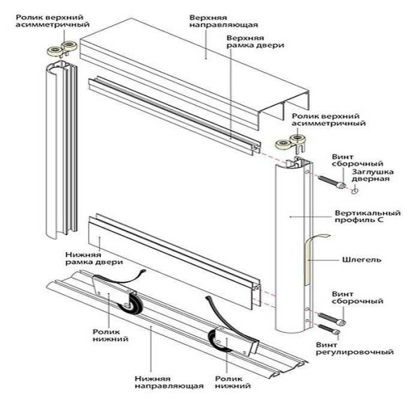 Далее дело только за тем, какие и как сделать дверки. Самый оптимальный вариант — сделать раздвижные. Их схема на рисунке. Запчастей много, но разобраться можно.