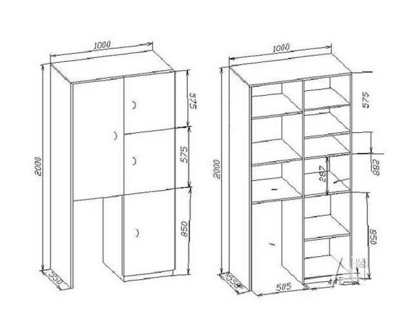 Все эти дверки могут быть на всю высоту шкафа, но удобнее делить его на две-три части, и на каждую навешивать свои дверки.