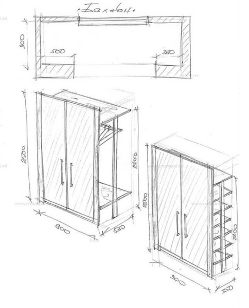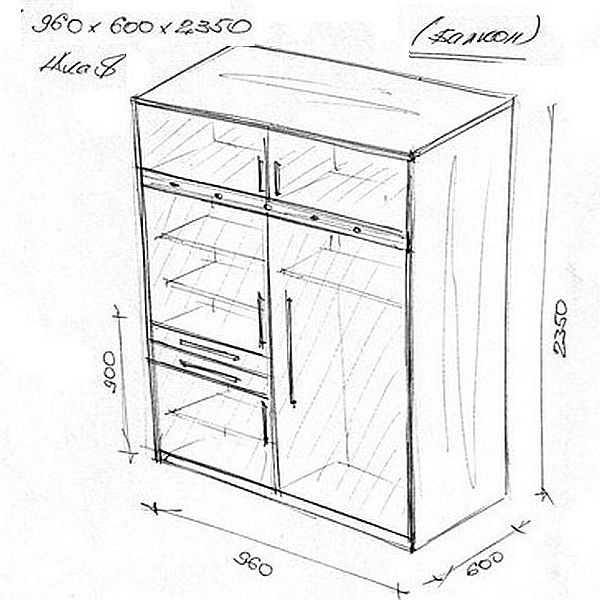 Говорить о каких-то стандартах относительно шкафов для балконов нельзя. И размеры и конфигурация, да и остекление у всех разное. Потому даже с размерами полок определяться приходится «по месту». Но несколько примеров, которые вы сможете изменить как вам нужно приведем.