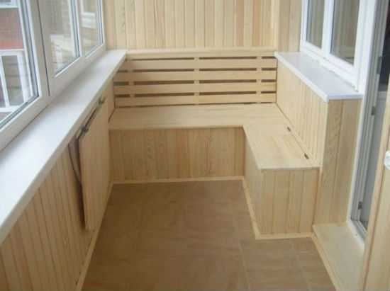 В свободном пространстве между стенкой шкафа и обшивкой балкона прибиты две полки. Чуть позже добавили несколько выше со скругленными краями. Последним этапом прибили под потолком и на полу плинтуса (закрыть щели), потом шлифовали вагонку шкуркой и красили морилкой.